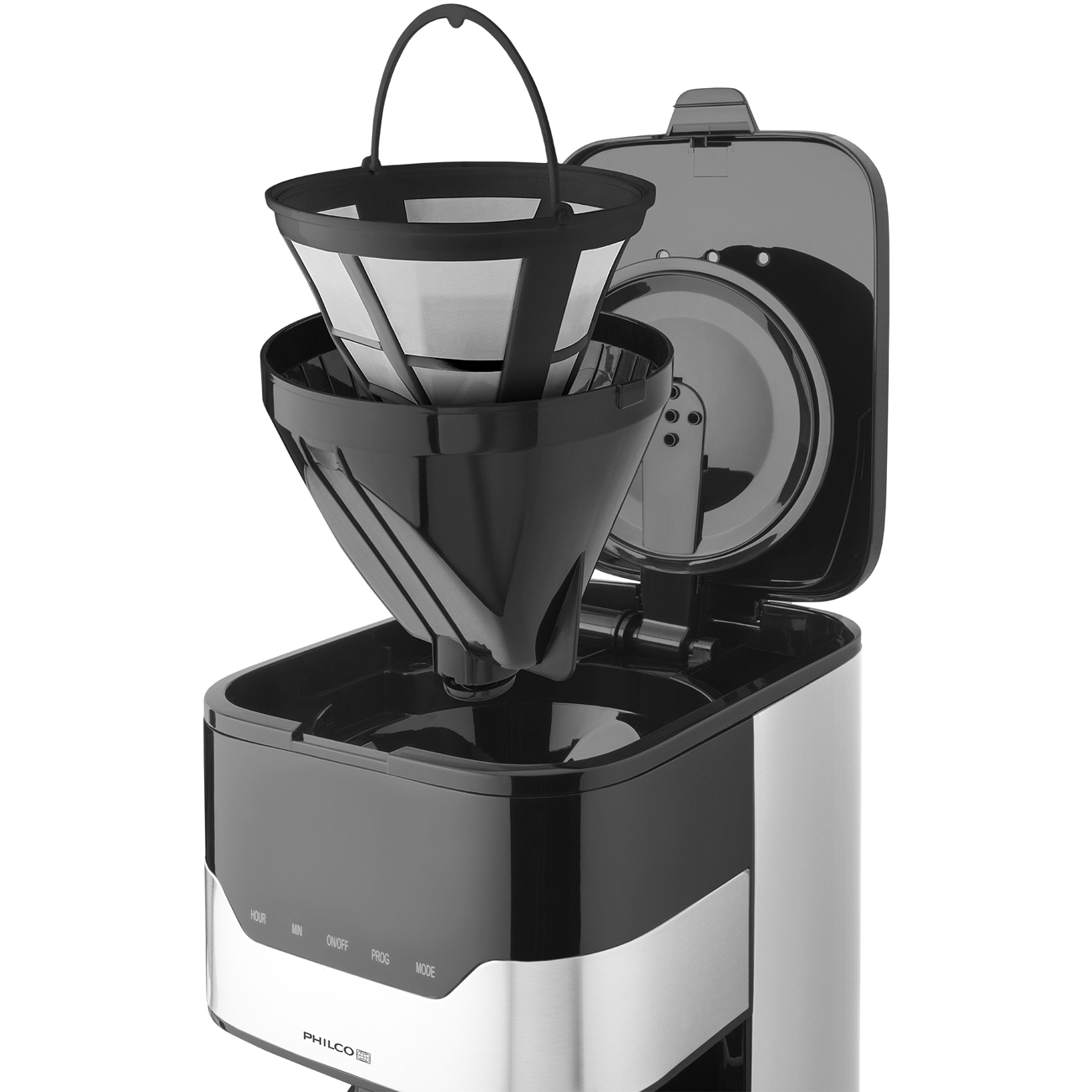 The main feature of this coffee maker PHCM 3000 is its thermal jug made of double wall. Therefore your coffee stays fresh with full taste for long time and it saves money for energy because you don’t have to keep brewed coffee warm after finish of brewing process. The other advantage is compact stainless steel appearance. It looks perfectly at home or in office. The thermal jug has capacity 1,2 l and that’s enough for preparation up to 12 cups of coffee. Coffee maker has drip stop function which stops dropping of coffee if you take off the kettle. You can check volume of water easily through water window in water tank. Coffee maker has nicely visible LCD display with programmable start of brewing process. You can choose between paper (not included) or permanent filter.